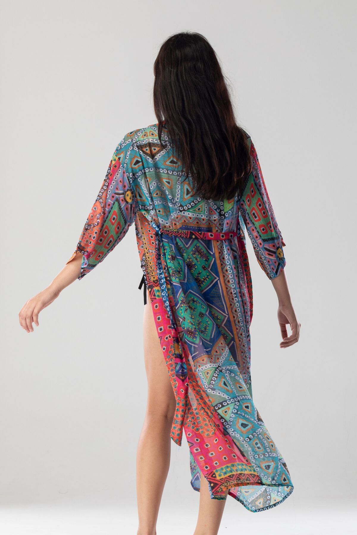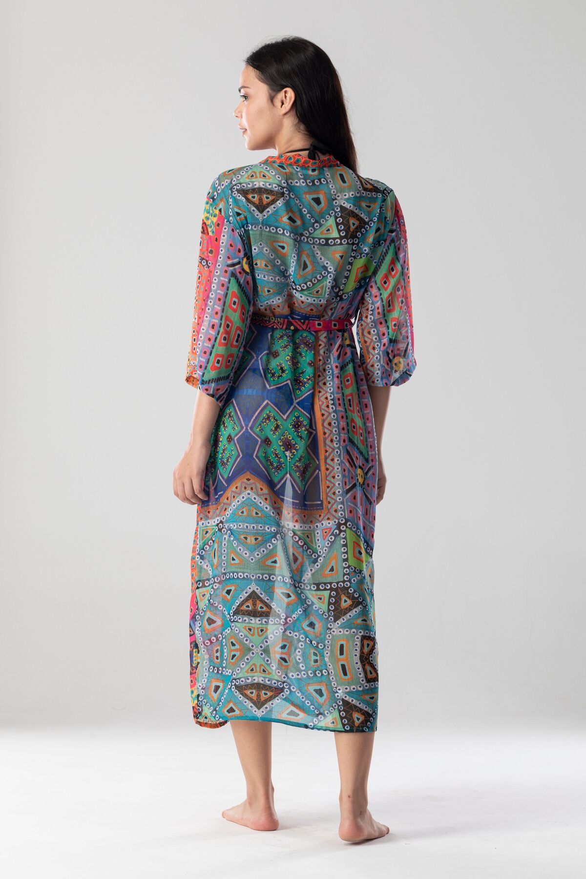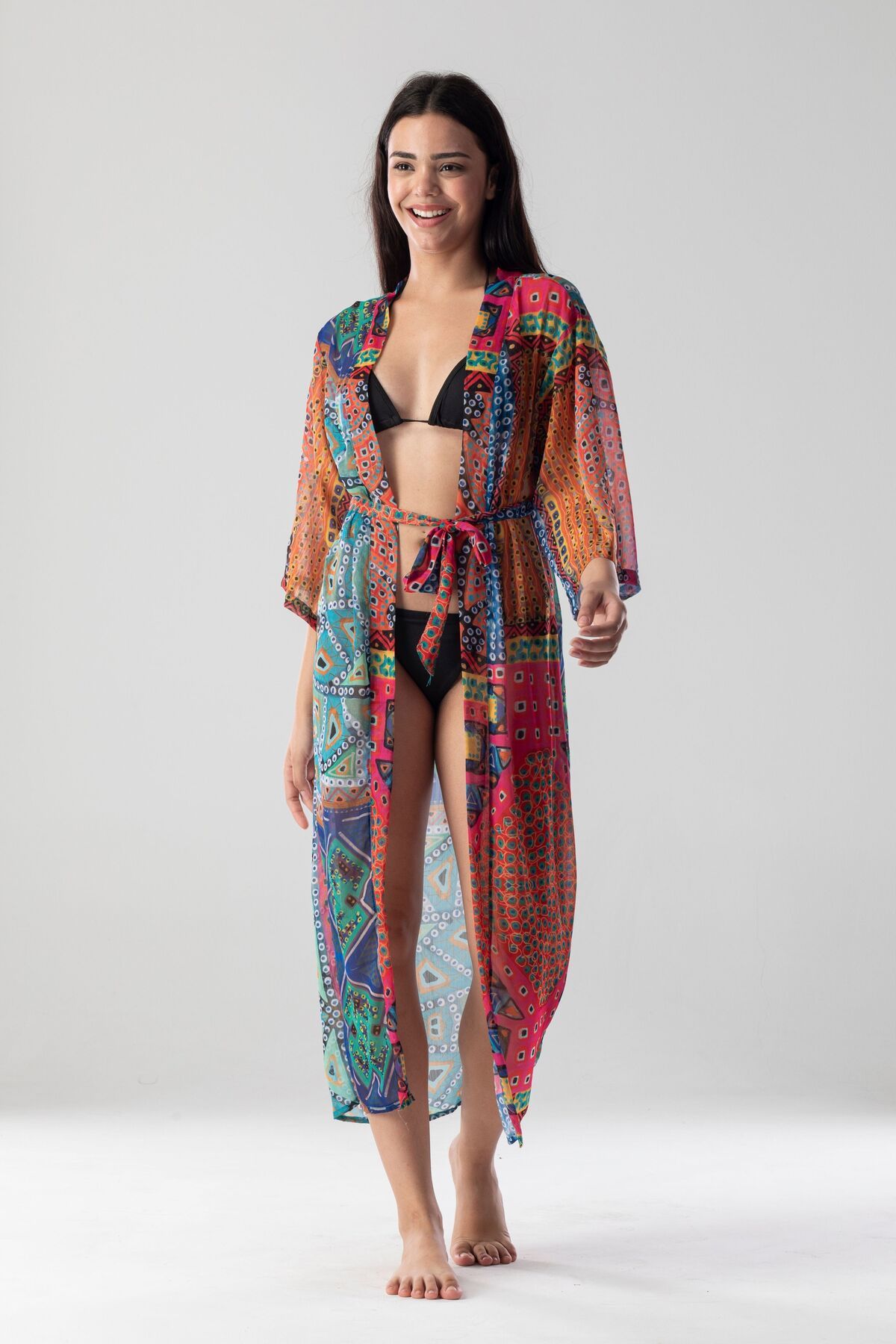 - Anadolu esintisi taşıyan özel desen tasarımı ile yaz aylarında plajda veya günlük kullanımda şıklığınızı koruyun.; - 30 derecede yıkama imkanı sayesinde kolay bakım avantajından faydalanarak uzun süreli kullanım sağlayın.; - Kruvaze kapama şekliyle modern ve zarif bir görünüm elde edin; kuşak detayı ise belinizi vurgulayarak feminen bir siluet oluşturur.; - Sürdürülebilirlik konusuna önem verenler için ideal olan bu ürün, çevre dostu malzemelerden üretilmiştir.; - Etnik desenleriyle dikkat çeken tasarım, genç ve dinamik tarza sahip kadınların tercihi olacak şekilde tasarlanmıştır.; - Uzun kollu yapısıyla serin yaz günlerinde ideal konforu sunarken, dokuma kumaşı dayanıklılık açısından da üst düzeydir.; - Loose kalıp seçeneği rahat hareket etme özgürlüğü tanırken, uzun boy kesimiyle zarif bir duruş sergiler.; - Plaj giyimine uygun olarak tasarlanmıştır; hem şık hem de fonksiyonel bir seçimdir.; - Yoryo şifon dokuması hafifliği ve nefes alabilirliği ile gün boyu konfor sağlar; aynı zamanda estetik görünümünden ödün vermez.
