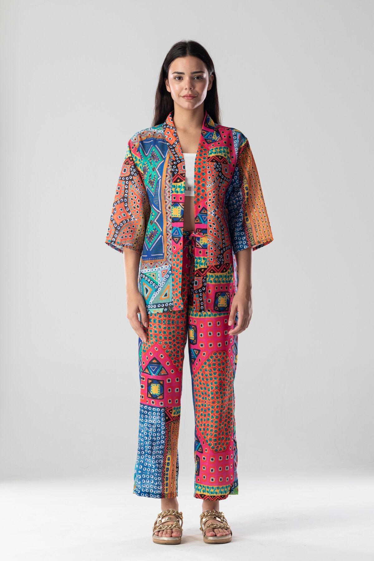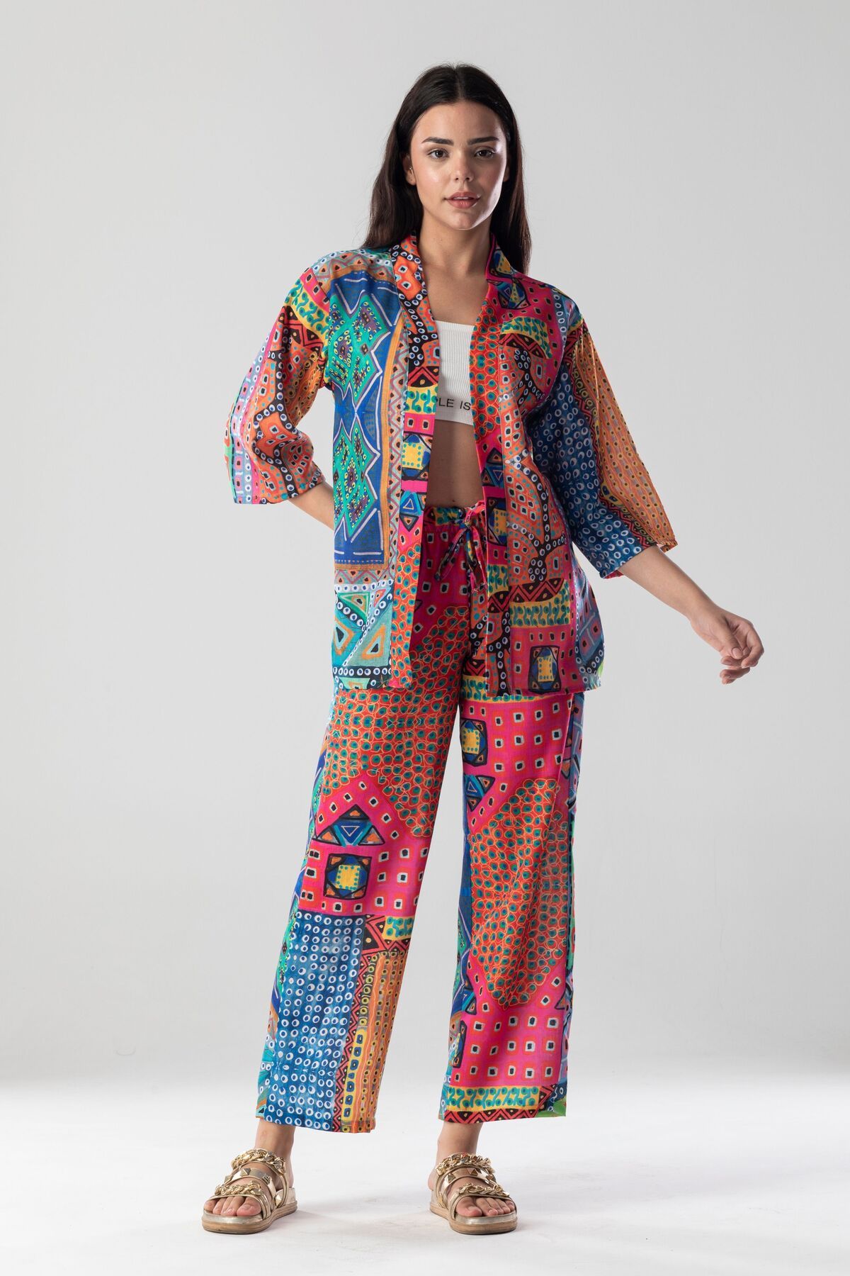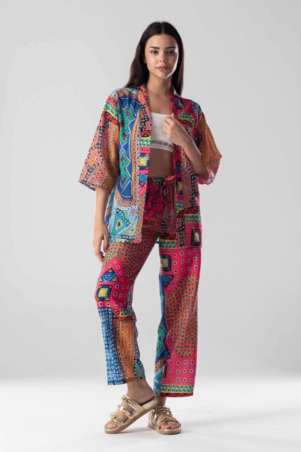 - Anadolu esintisi taşıyan özel tasarım, keten dokulu kimono pantolon takım ile yaz aylarının serinliğini ve şıklığını bir arada yaşayın.; - İki parçadan oluşan bu set, hem rahatlık hem de stil sunarak günlük kullanım için idealdir.; - Pratik cep detayları sayesinde küçük eşyalarınızı yanınızda taşımanız kolaylaşır.; - 30 derecede yıkama imkanı sunan bu takım, bakımının kolay olmasını sağlar.; - 2'li paketiyle bütçe dostu bir seçenek olarak gardırobunuza katkıda bulunur.; - Orta kalınlığındaki kumaşıyla mevsim geçişlerinde de konforlu bir kullanım vaat eder.; - Fashion forward kişiliğe sahip olan bu takım, trendleri takip edenler için mükemmel bir tercihtir.; - Geniş paça tasarımı modern ve rahat bir siluet oluştururken beli lastikli yapısı hareket özgürlüğü tanır.; - Yaz sezonuna uygun hafifliğiyle dikkat çeken bu takım, sıcak günlerde bile ferahlık hissi verir.; - Astarsız oluşuyla hafif ve doğal bir görünüm kazandırırken allover baskı tekniğiyle canlı renkler sunar.; - Bağcıklı kemeri sayesinde farklı stillere uyum sağlayabilir; belinizi istediğiniz gibi ayarlayabilirsiniz.; - Kutusuz olması pratik saklama avantajları sunarken, yüksek bel kesimi vücut hatlarınıza zarifçe oturur.; - Design koleksiyonundan gelen bu takım, özgün tasarımları sevenler için idealdir.; - Keten görünümlü dokumasıyla sofistike bir dokunuş katarken etnik deseniyle kültürel zenginlikleri yansıtır.; - Sürdürülebilirlik detayına önem vermeyen bu ürünün üretiminde çevreye duyarlı yaklaşımlardan uzak durulmuştur.; - Regular fit kesimiyle her bedene uygun rahatlık sunarken çift cepli tasarım fonksiyonellikten ödün vermez.; - Genç ruhlu kadınların enerjisini yansıtan bu takım, dinamik yaşam tarzlarına hitap eder.; - Dokuma kumaşı dayanıklılığı arttırarak uzun süreli kullanım imkanı tanır.; - Relaxed kalıbıyla vücudu sarmayan ama aynı zamanda formda gösteren yapıdadır.; - Etnik deseniyle farklı kültürlerden ilham alan estetik anlayışa sahip olmanızı sağlar.; -Regular boy ölçüsüyle standart bedenlere uygunluk göstererek geniş kullanıcı kitlesine hitap eder.; - Türkiye menşeli olması yerel üretim desteğini teşvik ederken keten görünümlü materyaliyle doğal bir hissiyat sunar.; -Bağımsız düşünmeyi benimseyenler için ideal olan bu takım, bağımsız ruha sahip bireylerin gardırobunda yerini almayı hak ediyor.