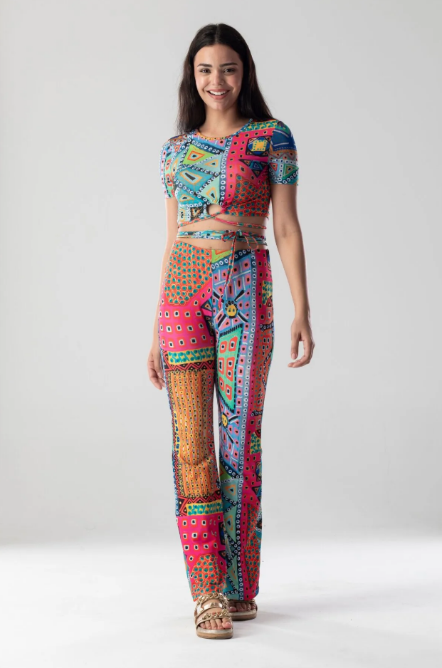 - Vücudu saran crop üst, yüksek bel palazzo pantolon ile tamamlanan bu takım, şıklığı ve rahatlığı bir arada sunar.; - %100 polyester materyali sayesinde uzun süreli kullanım için idealdir ve kolay bakım imkanı sağlar.; - Cut-out detayları ile modern ve cesur bir görünüm kazandırırken, allover baskı teknolojisiyle canlı renkler ve desenler ön plana çıkar.; - 30 derecede yıkama talimatına uygun şekilde temizlenebilir; böylece ürününüz ilk günkü gibi kalır.; - İki parçadan oluşan set, hem günlük kullanımda hem de özel anlarda tercih edebileceğiniz kombin seçenekleri sunar.; - İspanyol paça pantolon kesimi ile feminen hatları vurgular ve zarif bir siluet oluşturur.; - Bağlama veya bağcık detaylarıyla kişisel zevkinize göre ayarlama yapabilirsiniz; böylece her zaman mükemmel oturuşa sahip olursunuz.; - Etnik desenleriyle trendleri takip ederken aynı zamanda stil sahibi görünmenizi sağlar.; - Yüksek bel tasarımı sayesinde konforlu bir kullanım sunarken, slim fit kesimiyle vücut hatlarınıza mükemmel uyum sağlar.; - Cepsiz yapısıyla minimalist bir tarz sergilerken, takma kollar hareket özgürlüğünüzü kısıtlamaz.; - Genç yaş grubuna hitap eden dinamik ve enerjik tasarım anlayışını yansıtır.; - Örme kumaşı esnekliğiyle gün boyu rahat etmenizi garanti ederken likralı süprem dokusu yumuşaklık hissi verir.; - Sürdürülebilirlik detayının bulunmamasına rağmen, kaliteli malzemelerden üretilmiştir.; - Trend ortamlarda dikkat çekici bir duruş sergileyerek stil sahibi görünmenizi sağlar.; - Takma kol tipine sahip olmasıyla farklı stillere kolayca adapte olabilme avantajına sahiptir.