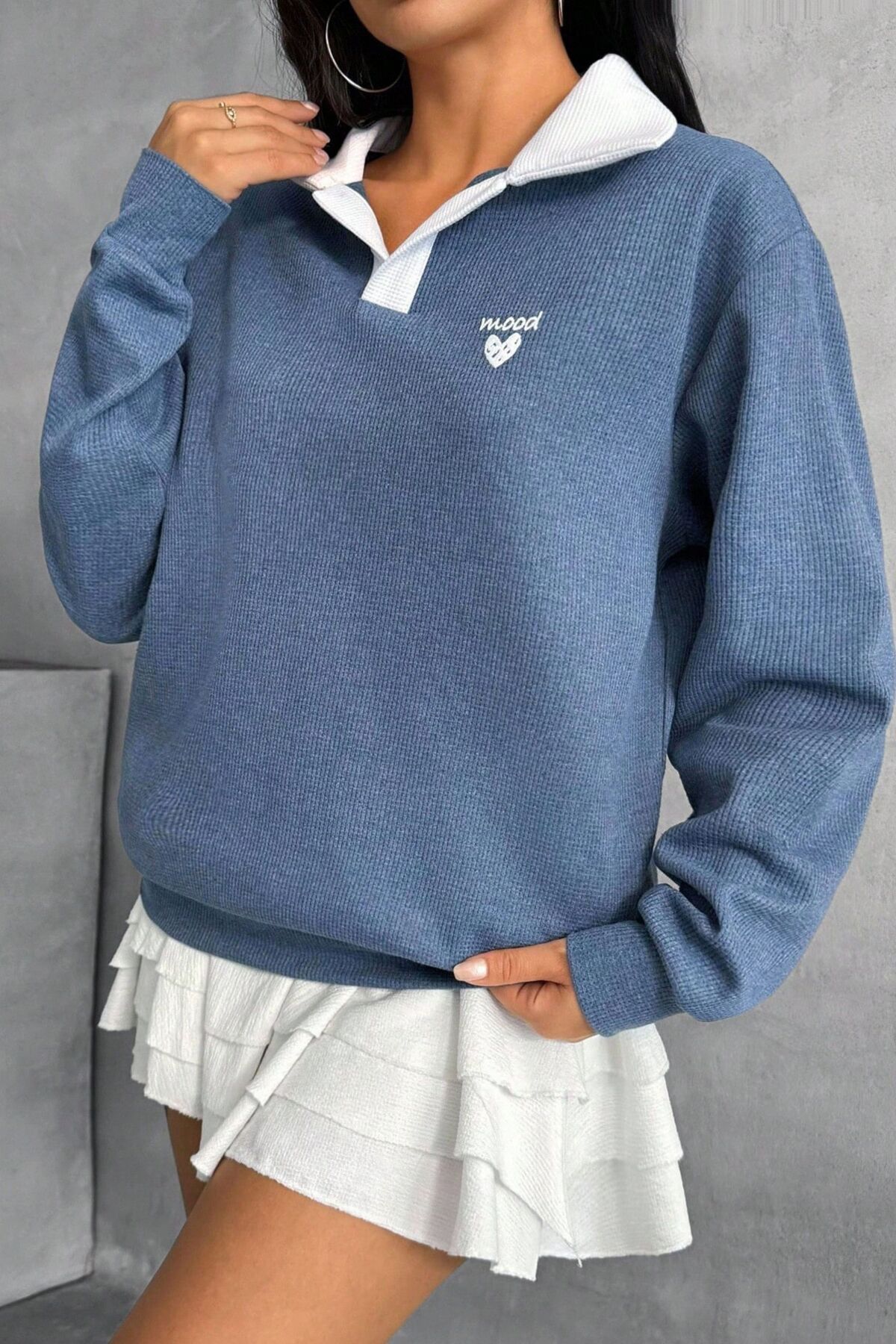 Polo Yaka Kalp Nakış Detaylı Waffle Kumaş Mevsimlik Sweatshirt