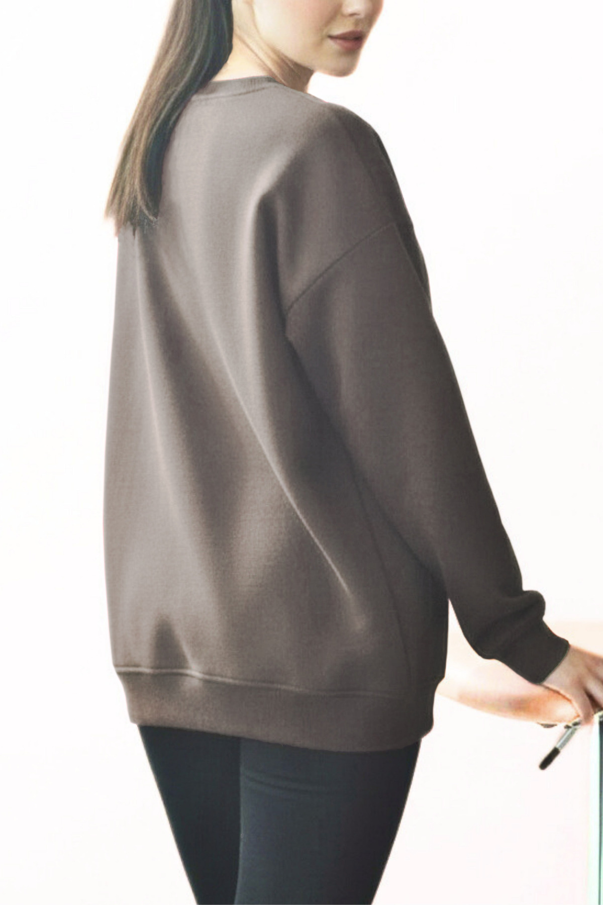 Tas Rengi Kadin Polarli Sicak Tutan Örme 3 Iplik Pamuk Basic Sweatshirt